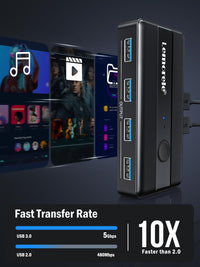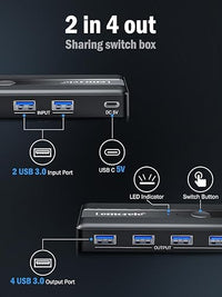 - Multi-device sharing The Lemorele USB switch 3.0 can share 4 USB 3.0 peripherals between 2 computers, and can also connect printers, scanners, mice, keyboards, USB drives, hard drives, etc.