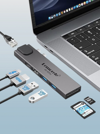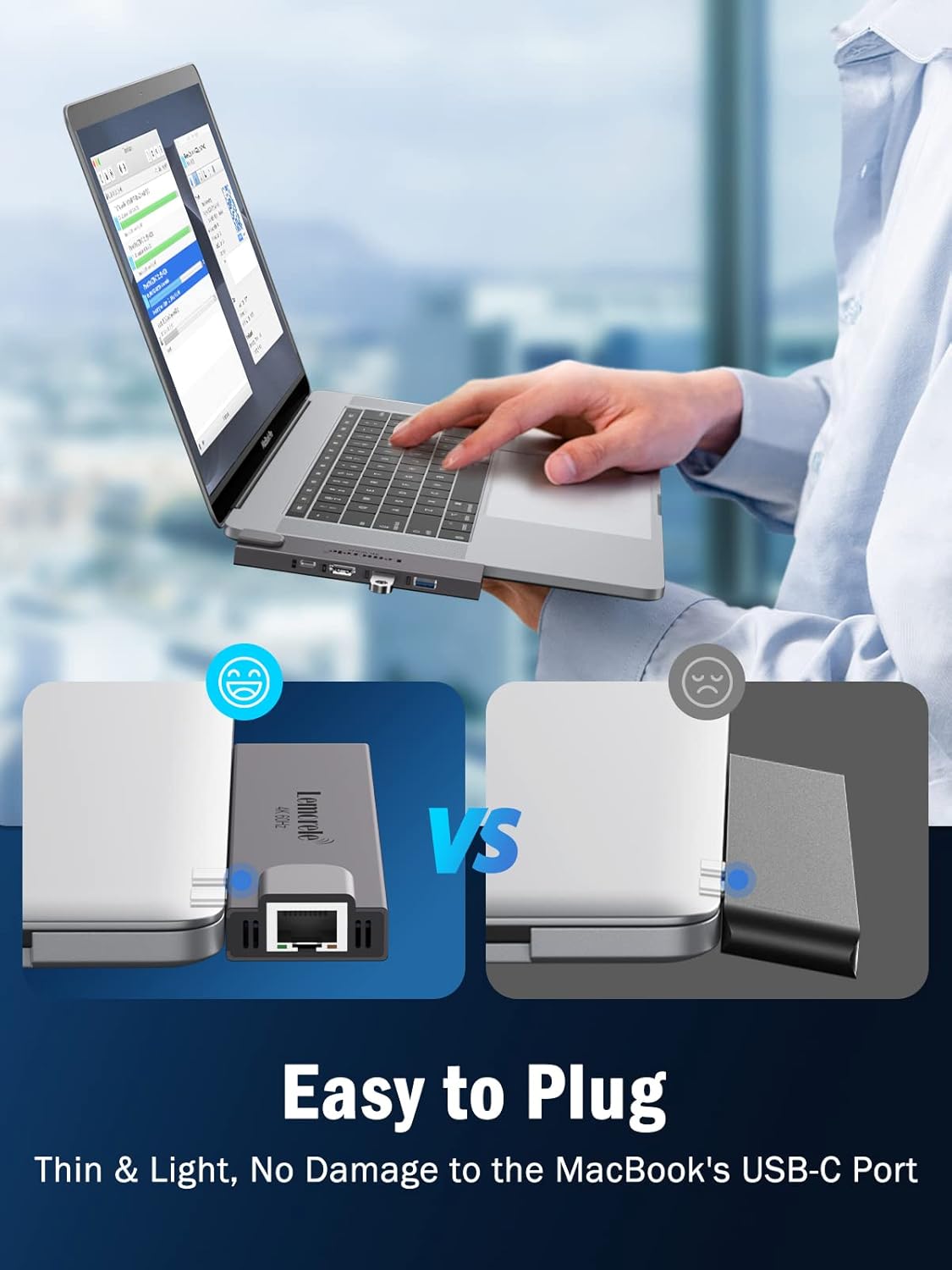 - 7 IN 2 USB C HUB for MacBook Lemorele USB-C docking station with aluminum alloy body, designed for MacBook Pro (2020–2016) and MacBook Air (2020–2018). Expands two USB-C ports to HDMI 4K@60Hz, Thunderbolt 3 (40Gbps, 4K@60Hz, 100W PD), Gigabit Ethernet, 2×USB 3.0, and SD/TF readers. Note: Not compatible with protective cases.
